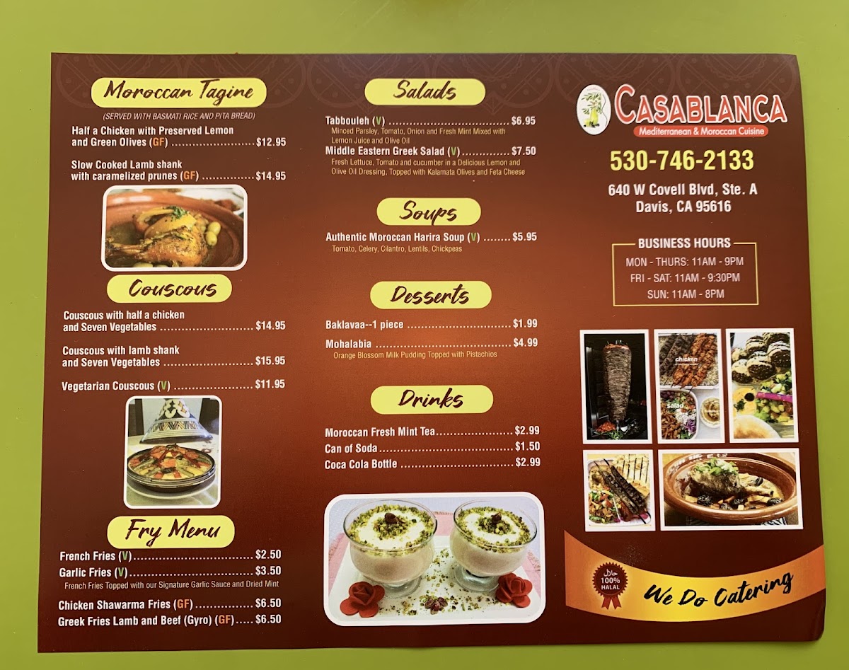 Step into a world of bold flavors and vibrant aromas with the Casablanca Davis Menu, where every dish feels like a little culinary adventure. From the moment you scan through the options, you’ll notice the care in blending traditional Moroccan spices with fresh, locally sourced ingredients. Whether it’s a perfectly seasoned tagine or a crisp, zesty salad, each plate seems to tell its own story, inviting you to savor each bite.